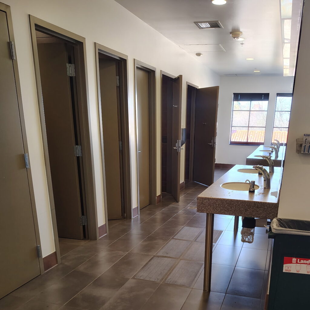 All-gender bathrooms have a shared area for sinks, but private stalls with floor-to-ceiling doors that close, lock, and give complete privacy. In other words, they don’t have the kind of barely-private stalls you might be used to in a public restroom – those doors with big gaps at the top and bottom and cracks around the side.
