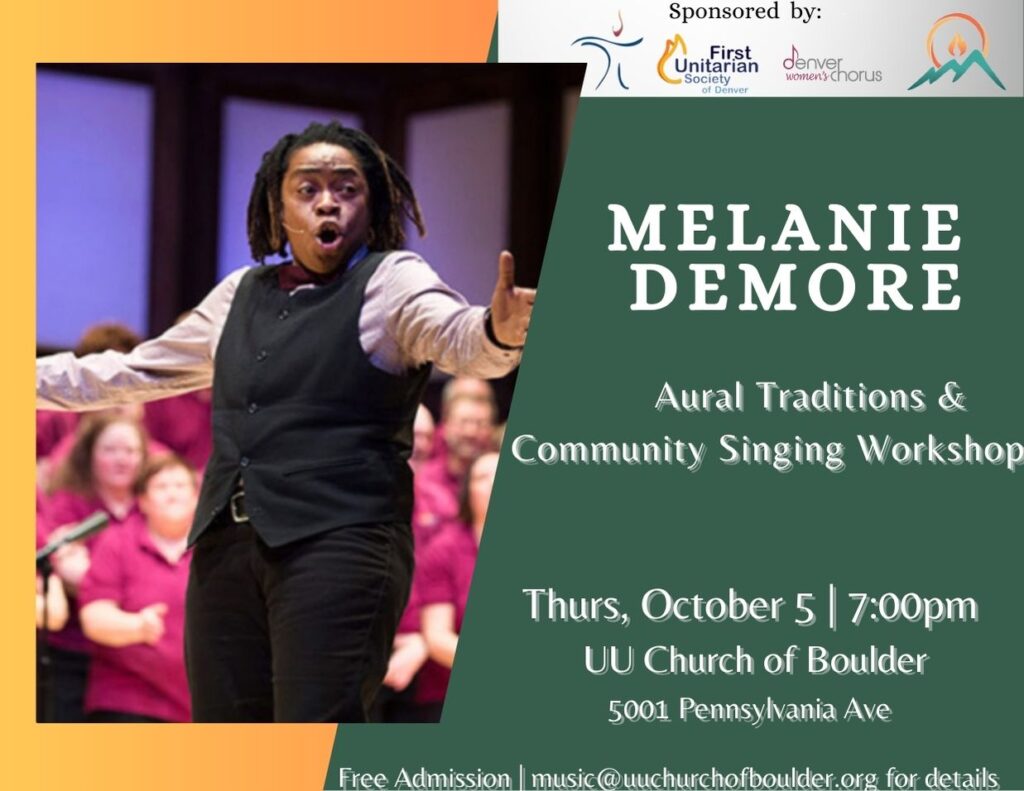 Join us for an evening of singing, sharing, and education with Melanie DeMore on Thursday, October 5 at 7:00pm! In this special workshop, Melanie will teach songs that singers can take back to their own music spaces and share the how and why of performing the music of other cultures.