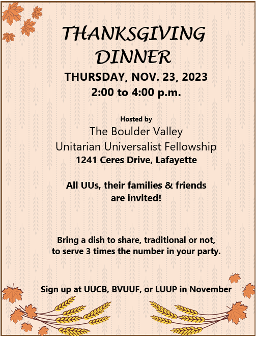 Instead of Circle Suppers in November and December, there will be holiday meals! On Thanksgiving Day, Nov. 23, we are invited to the Boulder Valley UU Fellowship in Lafayette for a collaborative Thanksgiving pot luck feast at 2 p.m. in their building, 1241 Ceres Drive, not far off of South Boulder Road. All UUs and their families and friends are invited. For decades we have alternated hosting a Thanksgiving feast with the Fellowship. We’ve enjoyed the traditional Thanksgiving food, but with many non-traditional items as well to satisfy all dietary needs and desires But in recent years the collaboration has been different.